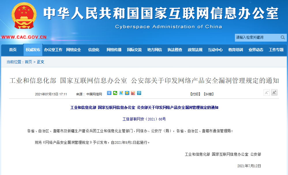 中工网讯 据国家网信办官网消息,7月12日,工业和信息化部、国家互联网信息办公室、公安部联合印发《网络产品安全漏洞管理规定》(以下简称《规定》),自2021年9月1日起施行。《规定》要求,网络产品提供者发现或者获知所提供网络产品存在安全漏洞,应当在2日内向工业和信息化部网络安全威胁和漏洞信息共享平台报送相关漏洞信息。