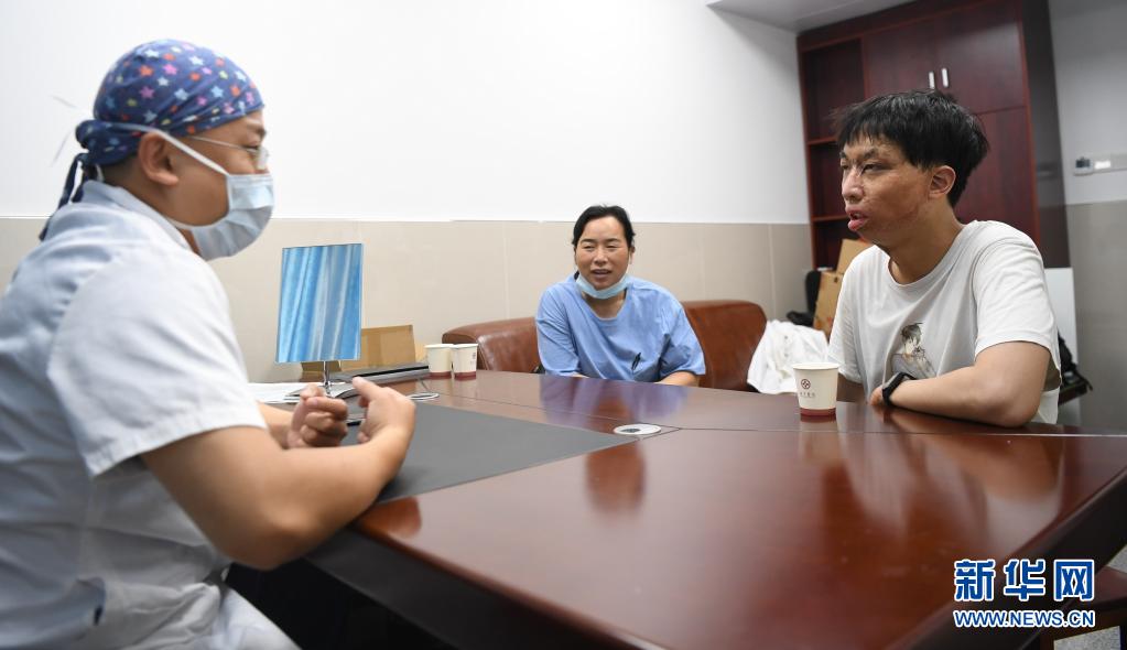 7月12日,南方医科大学南方医院整形外科医师张攀(左)为“面具男孩”周涛及他的妈妈介绍手术治疗方案。