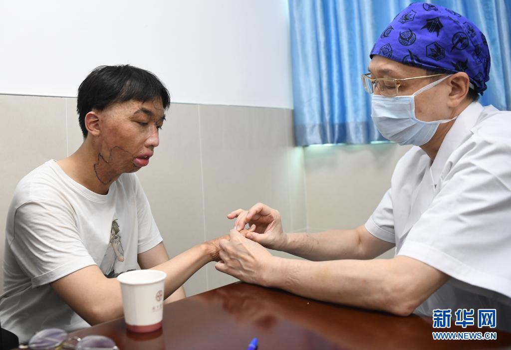 7月12日,南方医科大学南方医院整形外科主任胡志奇(右)面诊时查看“面具男孩”周涛手部情况。