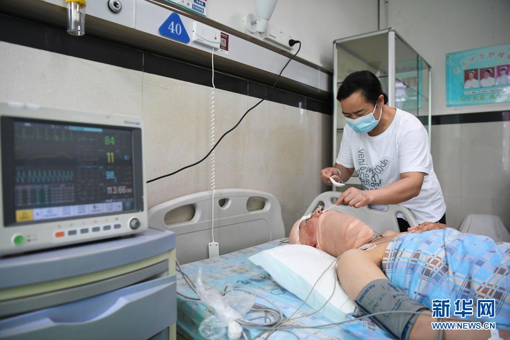 7月15日,手术后暂时不能进食,“面具男孩”周涛妈妈用棉签蘸水为他湿润嘴唇。