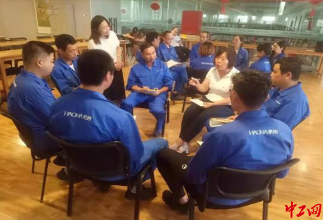 中工网讯 7月11日下午,山东省平度市总工会职工心理健康服务讲师团一行5人,到青岛豪纳化工科技有限公司职工心理健康(EAP)服务站,带领职工开展一期心理团体辅导活动。国家二级心理咨询师穆宝娟以团体辅导的形式,让职工们真正感受到团结友爱、信任互助的正能量,学习掌握在工作生活中有效地交流沟通技巧,明确更好地爱自己、爱家人、爱工作、爱企业,就是爱国家。