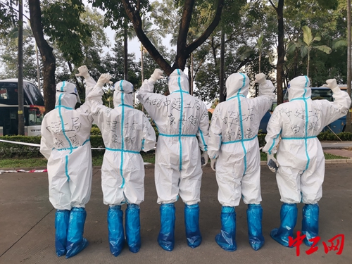 志愿者小队此行任务是深入南沙区被全部封闭的疫情发源地,将不同街道的密切接触者从所在的小区通过政府提供的大巴车,顺利转移到不同的隔离酒店,按照名单一一进行核对,指引密接者上车登记,并适当给予心理疏导,到达酒店后与接应工作者对接,确保每一名密接者不落队,不出差错。密接者上车扫出红彤彤的健康码,就意味着也许有可能正与病毒面对面,他们不禁生出了害怕的情绪,但想到自己身上所背负的责任,想到身前车上坐着的20多名密切接触者,想到身后的住宅区,志愿者们还是坚持把任务进行下去。经过漫长的7个小时,透过水雾阻挡的护目镜,终于看到了隔离酒店的大门,也看到了一直在酒店忙碌的防疫战友。此时他们才意识到浸透全身的汗水、被双层口罩压抑造成的胸闷、双腿双手被胶带紧勒的疼痛,也陪伴了7个小时。