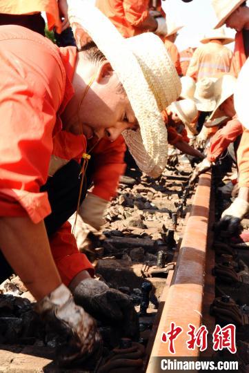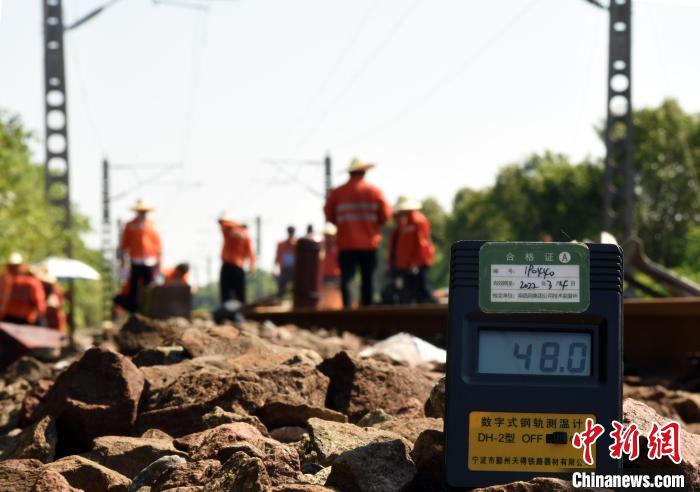 10时左右,钢轨温度达到了48℃,工人有条不紊开展工作,确保在“天窗”时间内完成施工任务。 王浩 摄