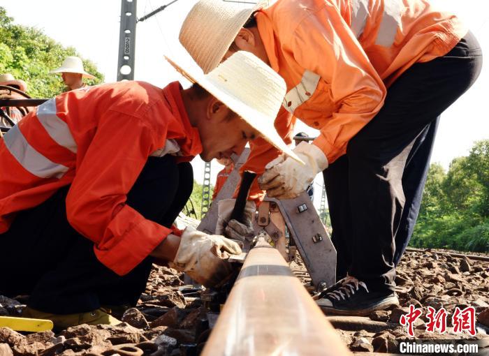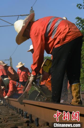 京九铁路是连接中国南北的主要繁忙干线。由于运量大,钢轨磨耗较快,容易发生钢轨伤损病害。“进入7月份,天气炎热,我们要加大对线路病害的整治维修,发现病害立即处置,确保暑运安全”。施工负责人周伟介绍。尽管是早上7点多,气温已经升高,做完施工前准备,工人们已经汗流浃背。