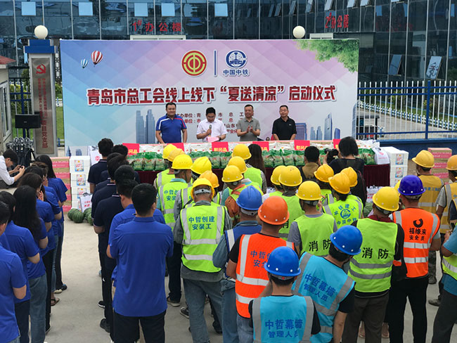 除了线上线下互动,市北区总工会还不断尝试新的“送清凉”方式。在区总工会副主席李学良带领下,工作人员直接将清凉物资驱车送到市北区在建大项目工地——青岛百洋健康科技园项目工地现场,50多名当值的建筑工人代表、安保人员,接过矿泉水、西瓜、果汁、绿豆等防暑降温物资。