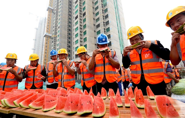 图为中建二局工友之间正在进行吃西瓜比赛,王欢/摄