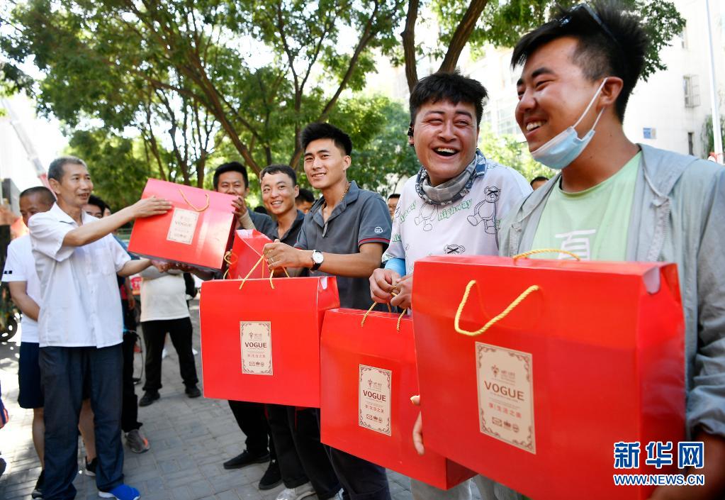 7月21日,银川市兴庆区新华街工会工作人员为快递员、外卖送餐员发放慰问品。