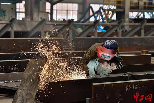中建二局阳光智造有限公司钢结构生产车间内,工人正在紧张地进行生产,不时就能见到火星四溅的场景。