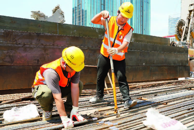 随着上海气温不断攀升,项目工地也启动了“两头班”模式,实行早开工、早收工,避开太阳最火辣的时间段。可即便避开了高温时间段,露天环境下,需要作业的钢筋被烤得滚烫。在现场可以看到张洪滔熟练地操作着工具钳,精准旋紧钢筋连接套筒,热汗从他脸颊上淌下,隔着橡胶手套的双手被烫得通红。