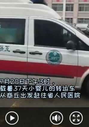 7月20日,下午刚过5点,郑州市龙湖外环西路上,水已经几乎没过了路边的绿化带,一辆白色救护车停在积水中打着双闪,无法前行。车上,河南省人民医院儿科PICU的医护人员从商丘接诊的小患者刚刚出生37天,此刻被妈妈抱在怀里,大家都焦急地望着窗外。