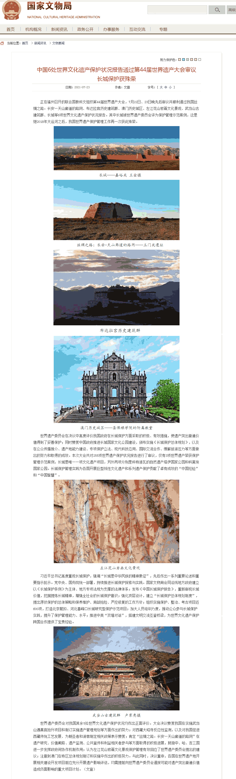 中工网讯 据国家文物局官网消息,正在福州召开的联合国教科文组织第44届世界遗产大会,7月22日、23日晚先后审议并顺利通过我国丝绸之路:长安—天山廊道的路网、布达拉宫历史建筑群、澳门历史城区、左江花山岩画文化景观、武当山古建筑群、长城等6项世界文化遗产保护状况报告。其中长城被世界遗产委员会评为保护管理示范案例,这是继2018年大运河之后,我国世界遗产保护管理工作再一次获此殊荣。