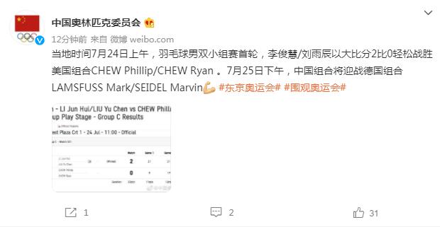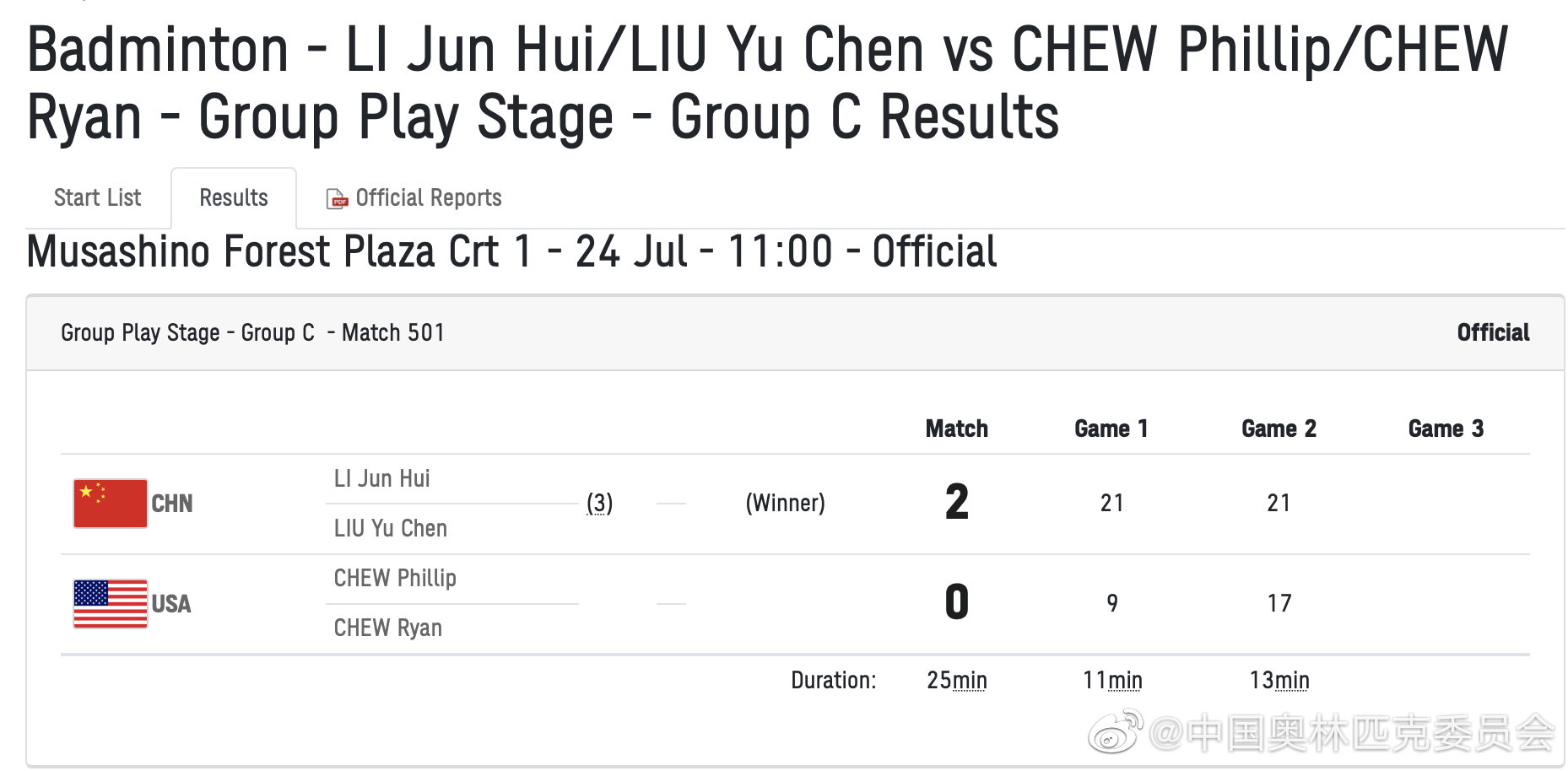 中工网讯 据中国奥林匹克委员会官微消息,当地时间7月24日上午,羽毛球男双小组赛首轮,李俊慧/刘雨辰以大比分2比0轻松战胜美国组合CHEW Phillip/CHEW Ryan 。7月25日下午,中国组合将迎战德国组合LAMSFUSS Mark/SEIDEL Marvin。
