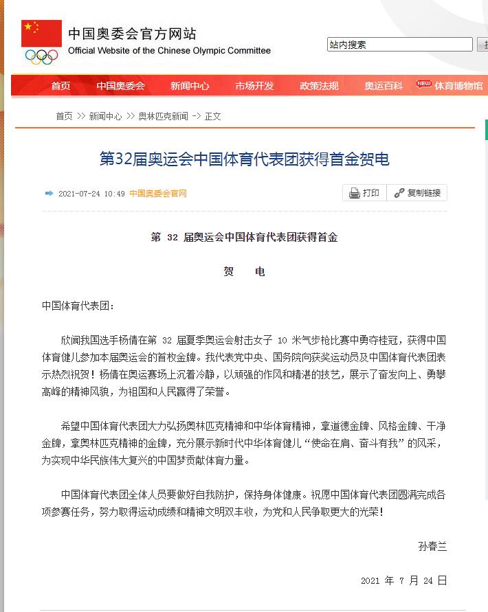 中工网讯 据中国奥委会官网消息,第32届奥运会中国体育代表团获得首金贺电。全文如下: