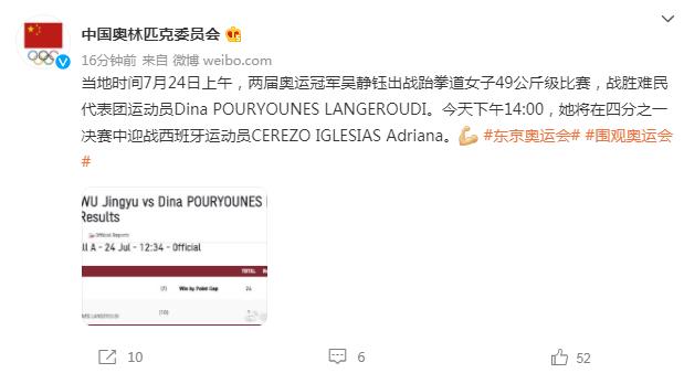 当地时间7月24日上午,两届奥运冠军吴静钰出战跆拳道女子49公斤级比赛,战胜难民代表团运动员Dina POURYOUNES LANGEROUDI。今天下午14:00,她将在四分之一决赛中迎战西班牙运动员CEREZO IGLESIAS Adriana。