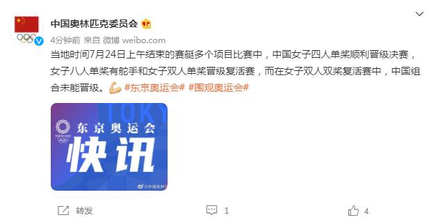 当地时间7月24日上午结束的赛艇多个项目比赛中,中国女子四人单桨顺利晋级决赛,女子八人单桨有舵手和女子双人单桨晋级复活赛,而在女子双人双桨复活赛中,中国组合未能晋级。