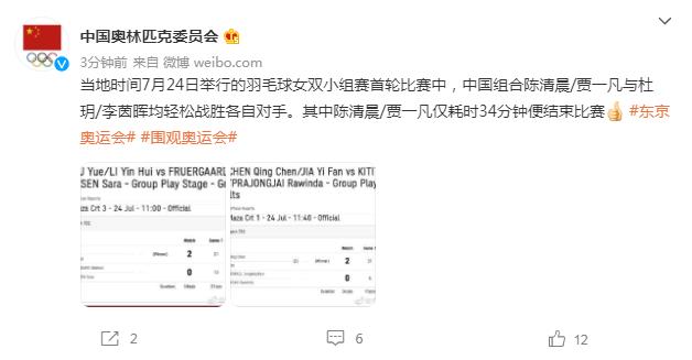 当地时间7月24日举行的羽毛球女双小组赛首轮比赛中,中国组合陈清晨/贾一凡与杜玥/李茵晖均轻松战胜各自对手。其中陈清晨/贾一凡仅耗时34分钟便结束比赛。