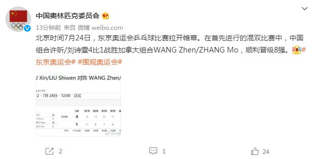 北京时间7月24日,东京奥运会乒乓球比赛拉开帷幕。在首先进行的混双比赛中,中国组合许昕/刘诗雯4比1战胜加拿大组合WANG Zhen/ZHANG Mo,顺利晋级8强。