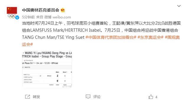 当地时间7月24日上午,羽毛球混双小组赛首轮,王懿律/黄东萍以大比分2比0战胜德国组合LAMSFUSS Mark/HERTTRICH Isabel。7月25日,中国组合将迎战中国香港组合TANG Chun Man/TSE Ying Suet。