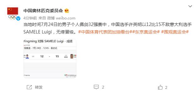 当地时间7月24日的男子个人佩剑32强赛中,中国选手许英明以12比15不敌意大利选手SAMELE Luigi,无缘晋级。