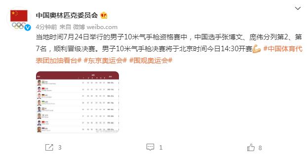 当地时间7月24日举行的男子10米气手枪资格赛中,中国选手张博文、庞伟分列第2、第7名,顺利晋级决赛。男子10米气手枪决赛将于北京时间今日14:30开赛。