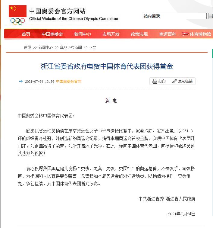 中工网讯 据中国奥委会官网消息,浙江省委省政府电贺中国体育代表团获得首金。全文如下: