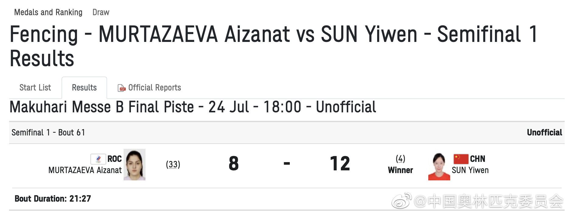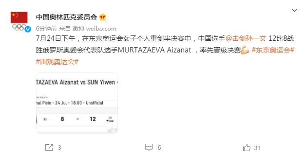 中工网讯 据中国奥林匹克委员会官微消息,7月24日下午,在东京奥运会女子个人重剑半决赛中,中国选手孙一文12比8战胜俄罗斯奥委会代表队选手MURTAZAEVA Aizanat,率先晋级决赛。