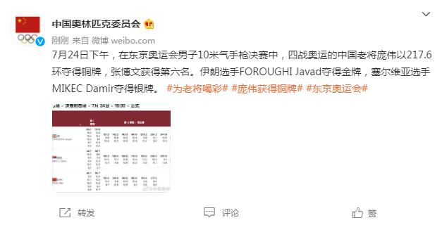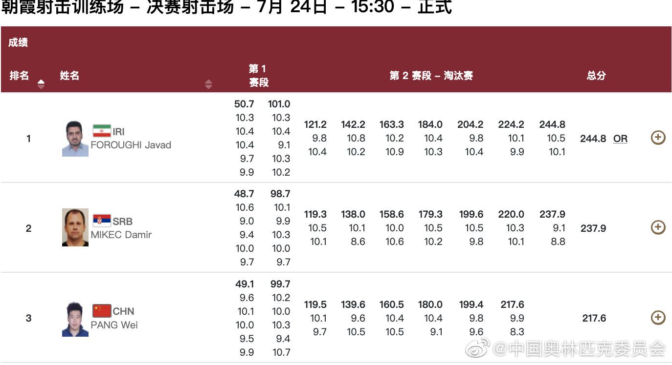 中工网讯 据中国奥林匹克委员会官微消息,7月24日下午,在东京奥运会男子10米气手枪决赛中,四战奥运的中国老将庞伟以217.6环夺得铜牌,张博文获得第六名。伊朗选手FOROUGHI Javad夺得金牌,塞尔维亚选手MIKEC Damir夺得银牌。
