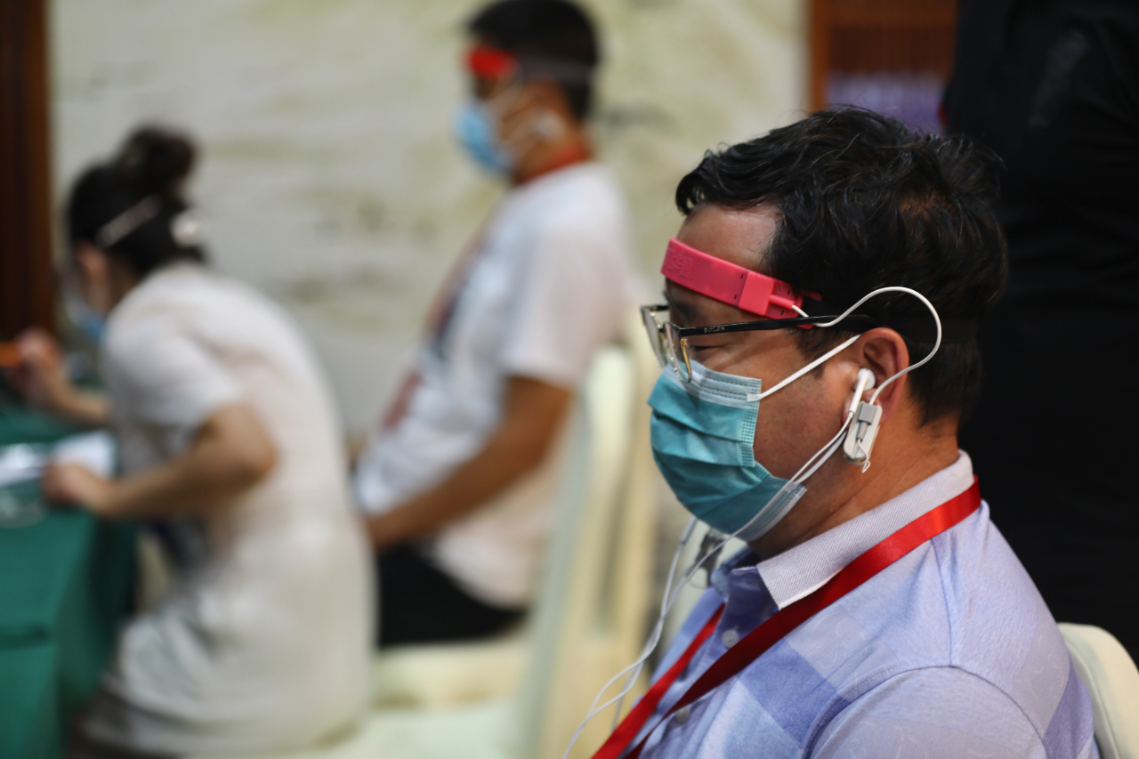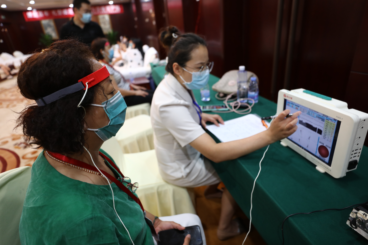 7月24日,2021年全国劳模疗休养活动第4天。劳模们正在进行脑状态检查,检测大脑疲劳程度等多个指标。