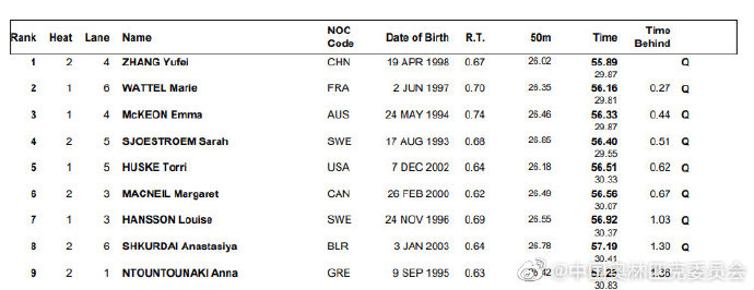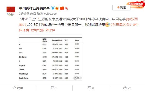 中工网讯 据中国奥林匹克委员会官微消息,7月25日上午进行的东京奥运会游泳女子100米蝶泳半决赛中,中国选手张雨霏以55.89秒的成绩在半决赛中排名第一,顺利晋级决赛。