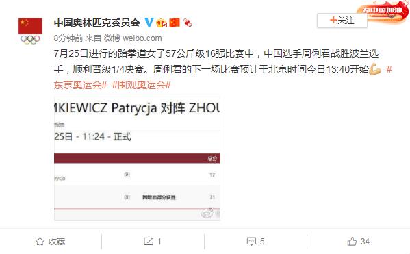 中工网讯 据中国奥林匹克委员会官微消息,7月25日进行的跆拳道女子57公斤级16强比赛中,中国选手周俐君战胜波兰选手,顺利晋级1/4决赛。周俐君的下一场比赛预计于北京时间今日13:40开始。