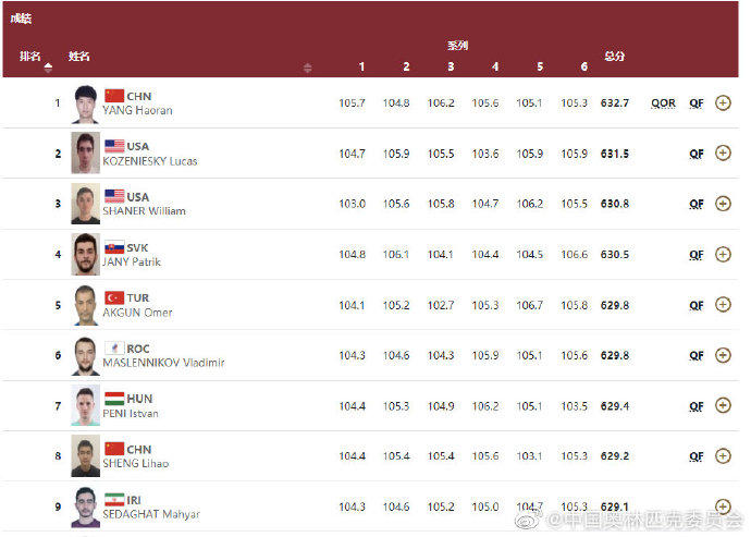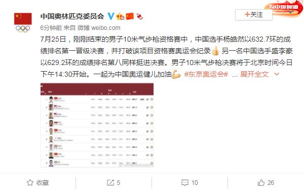 中工网讯 据中国奥林匹克委员会官微消息,7月25日,刚刚结束的男子10米气步枪资格赛中,中国选手杨皓然以632.7环的成绩排名第一晋级决赛,并打破该项目资格赛奥运会纪录,另一名中国选手盛李豪以629.2环的成绩排名第八同样挺进决赛。男子10米气步枪决赛将于北京时间今日下午14:30开始。
