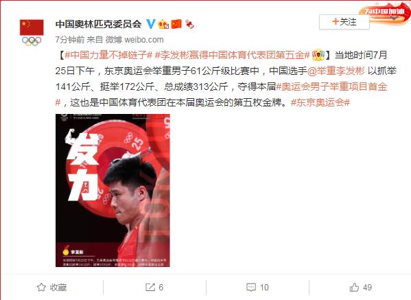 中工网讯 据中国奥林匹克委员会官微消息,当地时间7月25日下午,东京奥运会举重男子61公斤级比赛中,中国选手李发彬以抓举141公斤、挺举172公斤、总成绩313公斤,夺得本届奥运会男子举重项目首金,这也是中国体育代表团在本届奥运会的第五枚金牌。