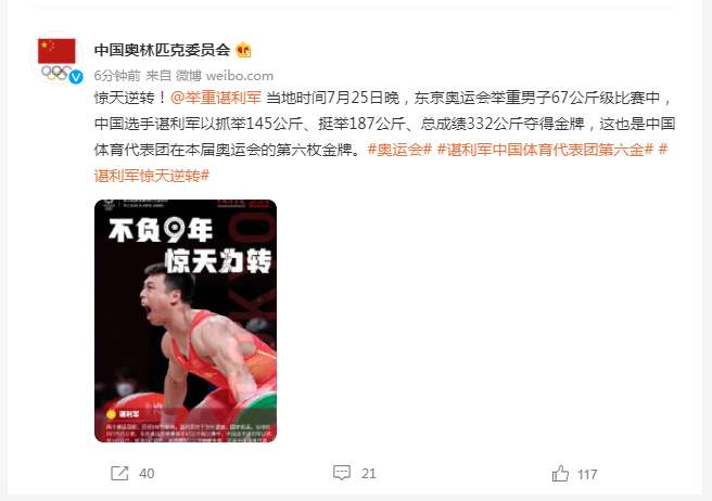 中工网讯 据中国奥林匹克委员会官方微博消息,当地时间7月25日晚,东京奥运会举重男子67公斤级比赛中,中国选手谌利军以抓举145公斤、挺举187公斤、总成绩332公斤夺得金牌,这也是中国体育代表团在本届奥运会的第六枚金牌。