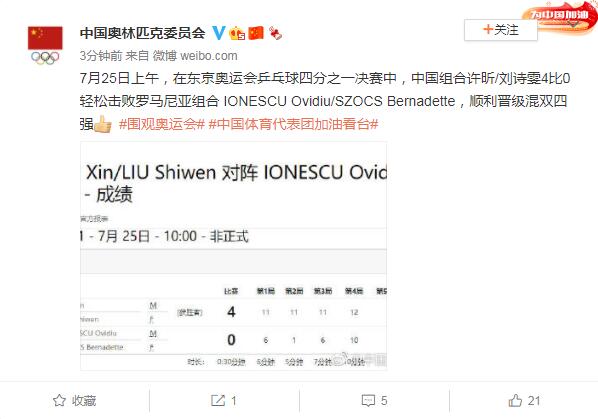 中工网讯 据中国奥林匹克委员会官微消息,7月25日上午,在东京奥运会乒乓球四分之一决赛中,中国组合许昕/刘诗雯4比0轻松击败罗马尼亚组合 IONESCU Ovidiu/SZOCS Bernadette,顺利晋级混双四强。