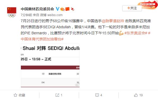 7月25日进行的跆拳道男子68公斤级16强赛中,中国选手赵帅 击败奥林匹克难民代表团选手SEDIQI Abdullah,晋级1/4决赛。他下一轮的对手是来自多米尼加的PIE Bernardo,比赛预计将于北京时间今日下午15:50开始。