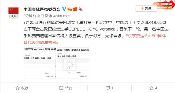 7月25日进行的奥运会网球女子单打第一轮比赛中,中国选手王蔷以6比4和6比3连下两盘击败巴拉圭选手CEPEDE ROYG Veronica,晋级下一轮。另一名中国选手郑赛赛遭遇日本名将大坂直美,负于对方,无缘晋级。