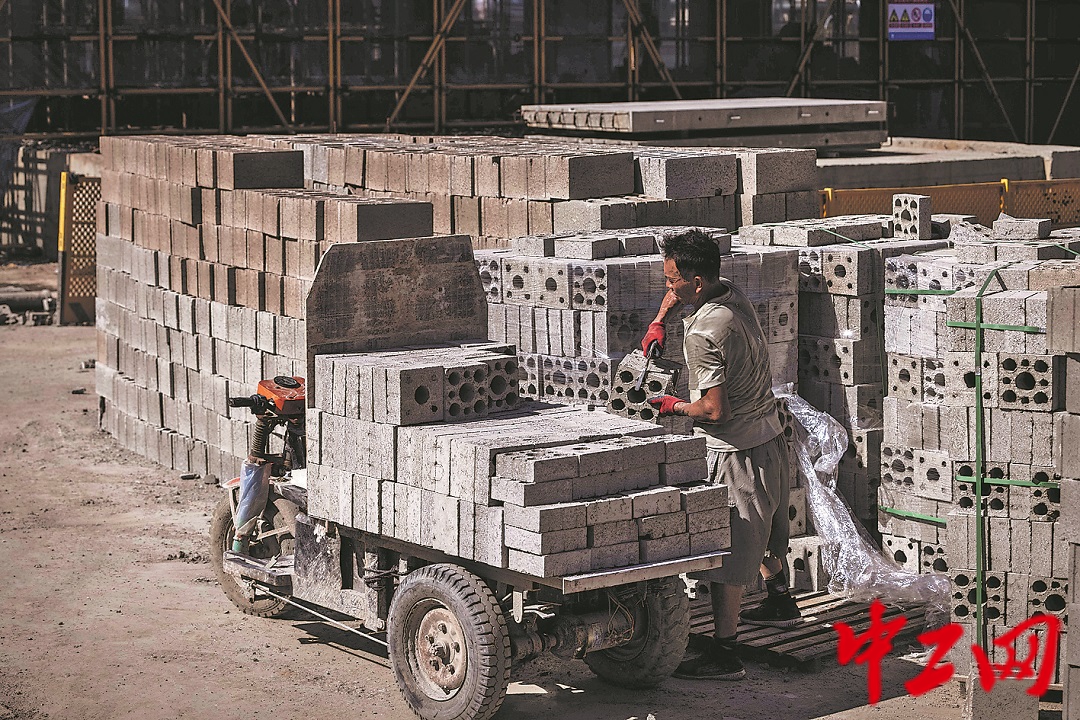 图②:高温下,未戴安全帽的工人在项目工地搬运防火建材。