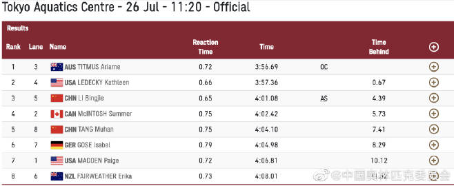 中工网讯 据中国奥林匹克委员会官微消息,当地时间7月26日上午,东京奥运会游泳女子400米自由泳决赛中,中国选手李冰洁游出4分01秒08,打破亚洲纪录并获得一枚铜牌!另一名选手汤慕涵以4分04秒10排名第5。