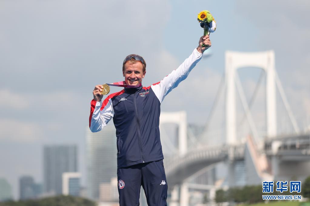 挪威选手布鲁蒙菲尔特获得男子铁人三项冠军,领奖时暂时摘下口罩
