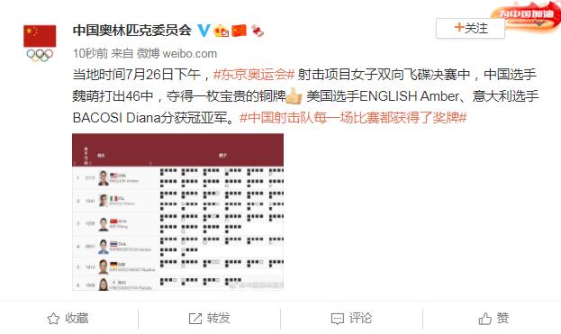 中工网讯 据中国奥林匹克委员会官微消息,当地时间7月26日下午,东京奥运会射击项目女子双向飞碟决赛中,中国选手魏萌打出46中,夺得一枚宝贵的铜牌。美国选手ENGLISH Amber、意大利选手BACOSI Diana分获冠亚军。
