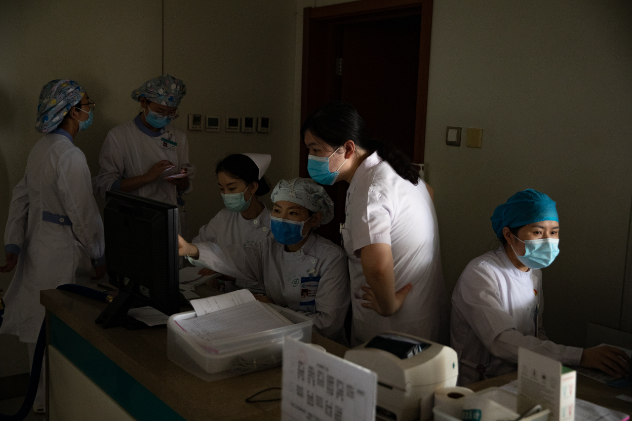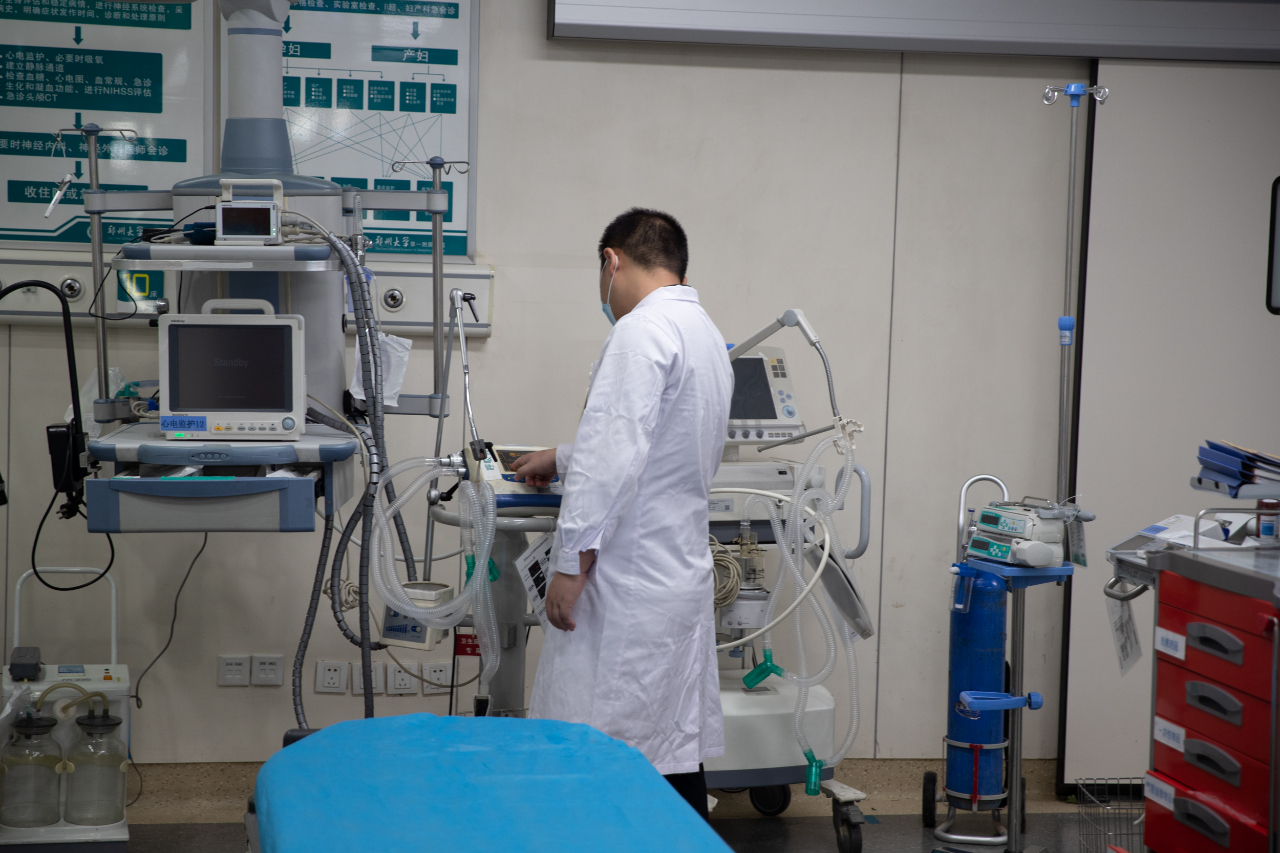 急诊室的一名医生正在调试设备,为迎接患者做准备。