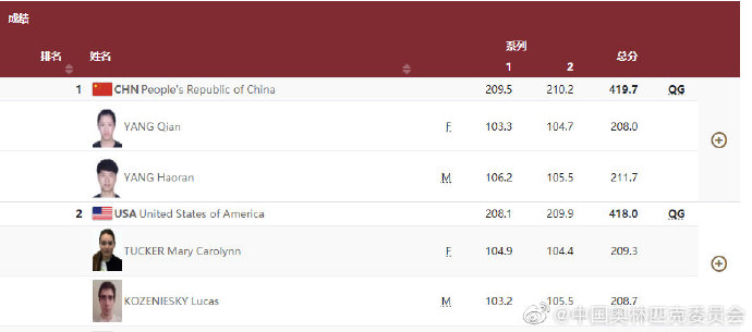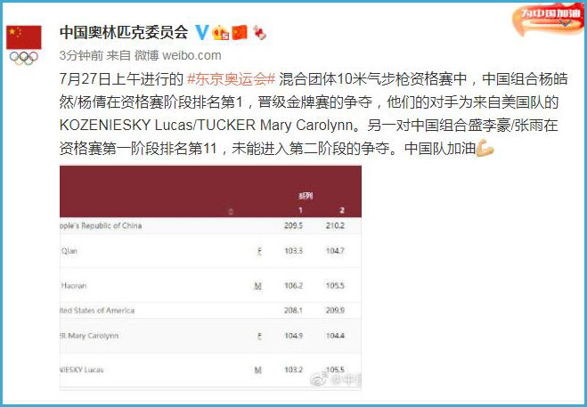 中工网讯 据中国奥林匹克委员会官微消息,7月27日上午进行的东京奥运会混合团体10米气步枪资格赛中,中国组合杨皓然/杨倩在资格赛阶段排名第1,晋级金牌赛的争夺,他们的对手为来自美国队的KOZENIESKY Lucas/TUCKER Mary Carolynn。另一对中国组合盛李豪/张雨在资格赛第一阶段排名第11,未能进入第二阶段的争夺。