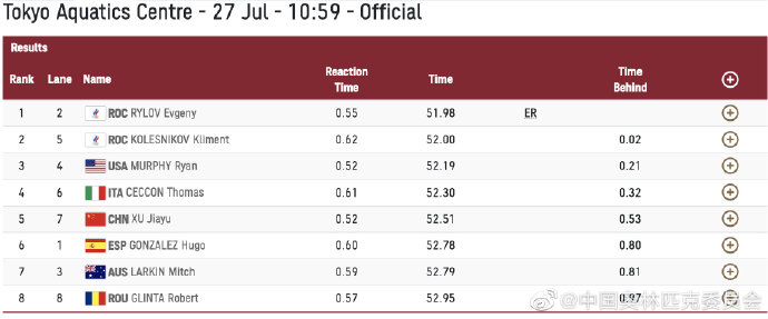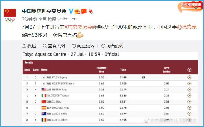 中工网讯 据中国奥林匹克委员会官微消息,7月27日上午进行的东京奥运会游泳男子100米仰泳比赛中,中国选手徐嘉余游出52秒51,获得第五名。