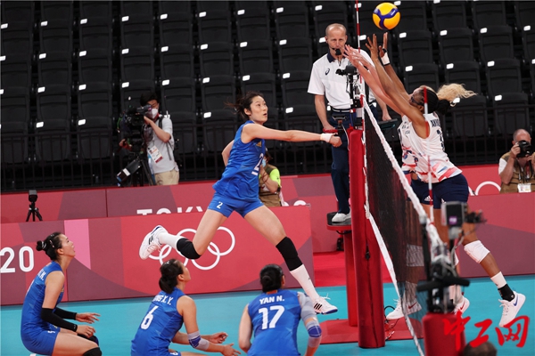这是首战失利的中国女排迎来东京奥运会第二场小组赛。队长朱婷带伤上场,砍下全队最高的18分,但中国队仍以0:3不敌美国女排,遭遇东京奥运小组赛两连败。这也意味着,若想小组出线,中国女排此后每一战都不容有失。