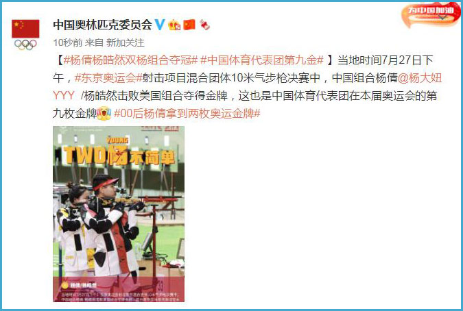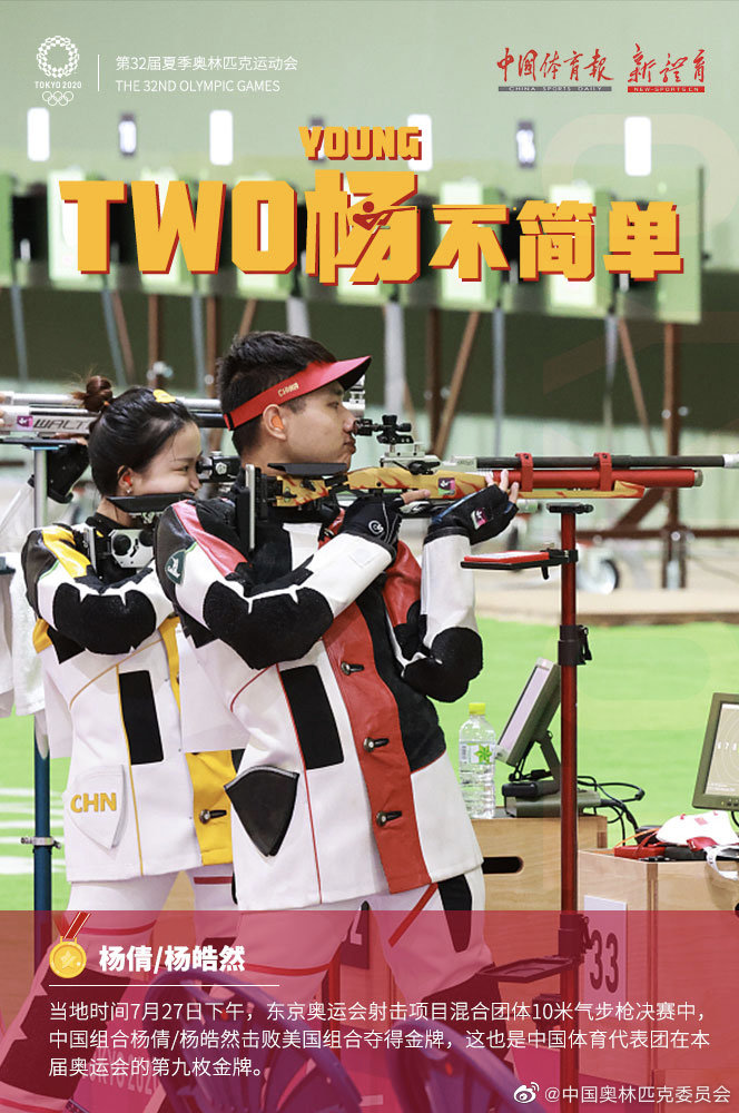 中工网讯 据中国奥林匹克委员会官微消息,当地时间7月27日下午,东京奥运会射击项目混合团体10米气步枪决赛中,中国组合杨倩杨皓然击败美国组合夺得金牌,这也是中国体育代表团在本届奥运会的第九枚金牌。