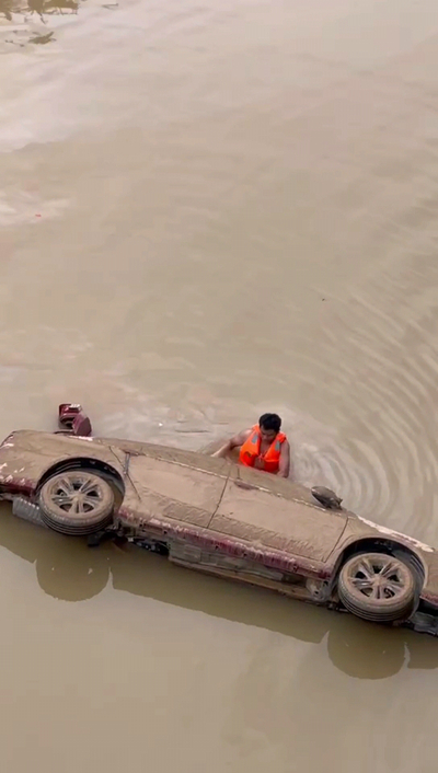 第二天睡醒后,他又回到救人的地方,才发现“京广北路隧道”几个字露了出来。几十辆车漂在水中,露出的部分裹着一层黄泥。他担心有人被困在车里,“我看到的车都排查了三遍,只要有一点露出来我就去看。”他先滑到车顶,再尝试打开车门。如果能打开,就把头留在外面,用脚伸进去试探。郑州市民张先生用手机录下了他排查车辆的过程,“我走了好久回来他还在”。