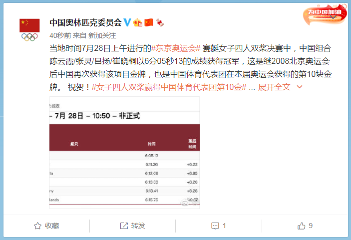 中工网讯 据中国奥林匹克委员会官方微博消息,当地时间7月28日上午进行的东京奥运会赛艇女子四人双桨决赛中,中国组合陈云霞/张灵/吕扬/崔晓桐以6分05秒13的成绩获得冠军,这是继2008北京奥运会后中国再次获得该项目金牌,也是中国体育代表团在本届奥运会获得的第10块金牌。