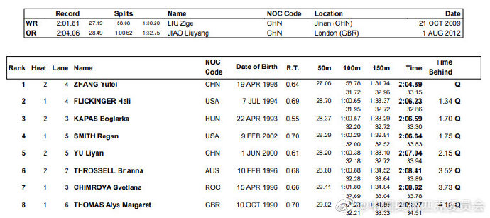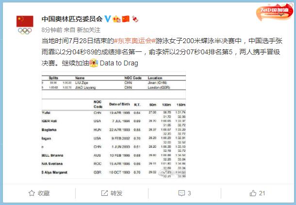 中工网讯 据中国奥林匹克委员会官方微博消息,当地时间7月28日结束的东京奥运会游泳女子200米蝶泳半决赛中,中国选手张雨霏以2分04秒89的成绩排名第一,俞李妍以2分07秒04排名第5,两人携手晋级决赛。