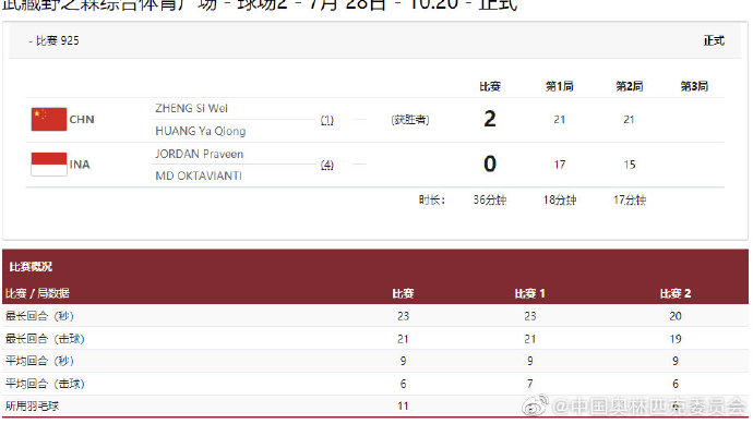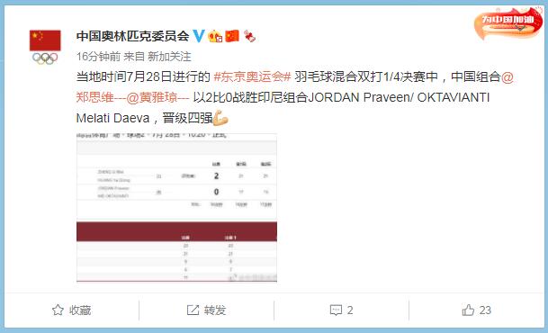 中工网讯 据中国奥林匹克委员会官方微博消息,当地时间7月28日进行的东京奥运会羽毛球混合双打1/4决赛中,中国组合郑思维/黄雅琼以2比0战胜印尼组合JORDAN Praveen/ OKTAVIANTI Melati Daeva,晋级四强。