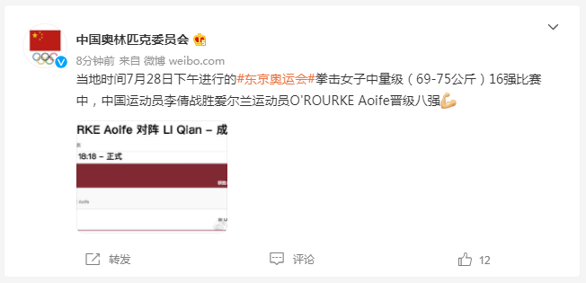 中工网讯 据中国奥林匹克委员会官方微博消息,当地时间7月28日下午进行的东京奥运会拳击女子中量级(69-75公斤)16强比赛中,中国运动员李倩战胜爱尔兰运动员O'ROURKE Aoife晋级八强。
